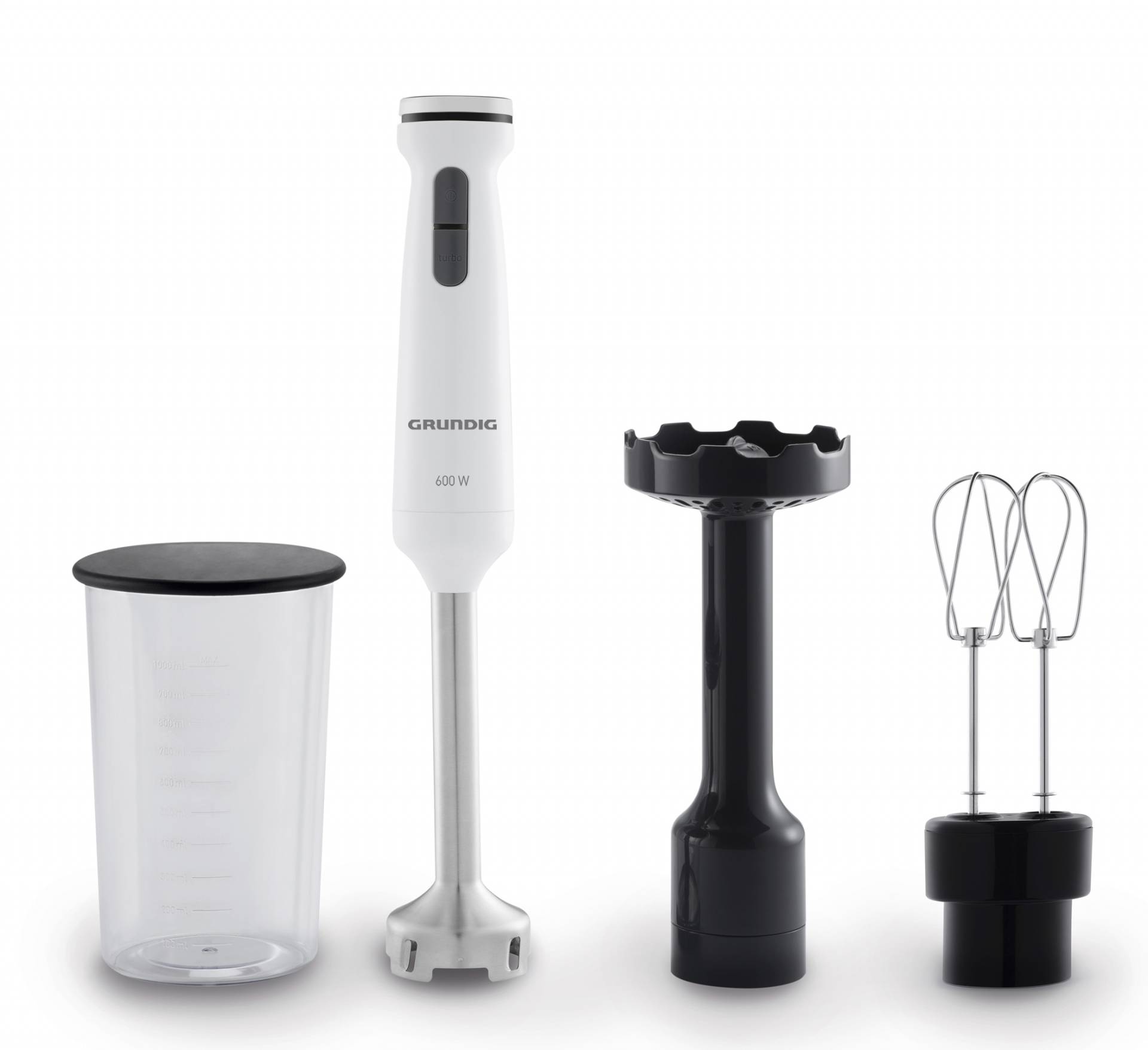 Der Mixer ist zusätzlich mit einem Kartoffelstampfer-Aufsatz und einem Mixeraufsatz für Desserts und Sahne ausgestattet. Außerdem ist im Lieferumfang ein 1 Liter Messbecher mit Frischhaltedeckel aus BPA-freiem Material.