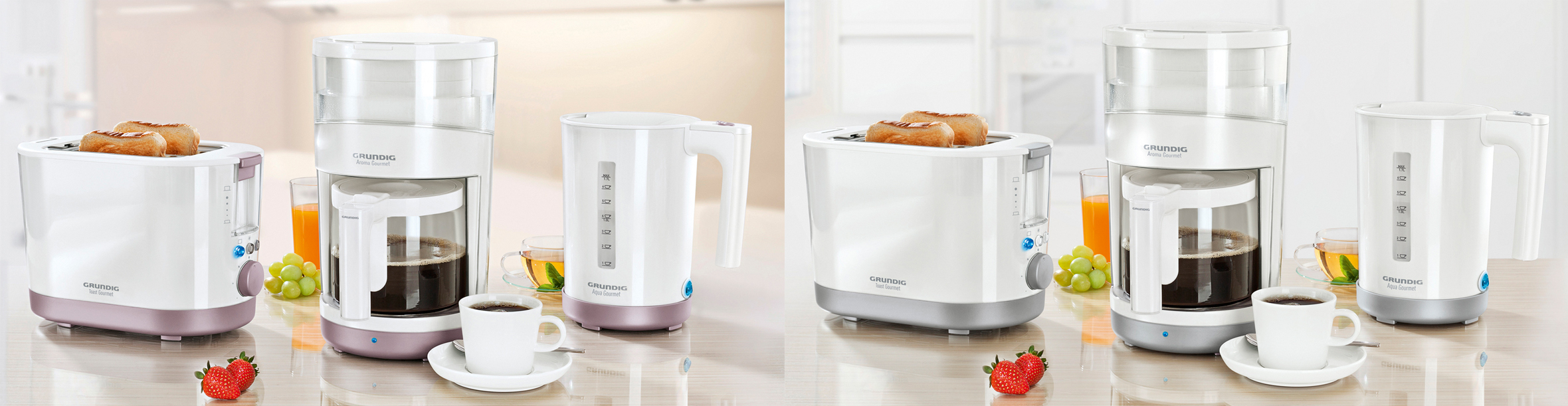 Das Grundig White Sense Frühstücksset mit metallischen Akzenten (Lavendel 4062, Silber 4060) ist ab November im Handel erhältlich: