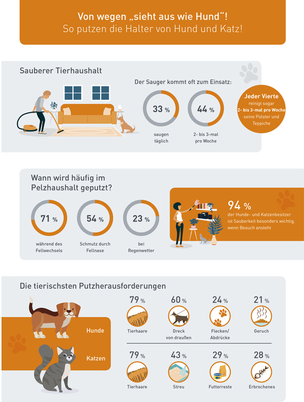 Beim Thema Haare sind sich Hund und Katz einig. Denn beim Verteilen ihres Fells produzieren sie für ihre Besitzer die mit Abstand lästigste Verschmutzung: Für mehr als drei Viertel aller Hunde- und Katzenbesitzer sind Tierhaare die wohl größte Sauberkeitsherausforderung. Insbesondere während der saisonalen Fellwechselzeiten wird bei 71 % sogar noch häufiger geputzt als sonst. Ansonsten sind es jeweils andere Verschmutzungen, mit denen Hunde und Katzen ihre Halter reinigungstechnisch auf Trab halten. Während Hundebesitzer zusätzlich mit von draußen hereingebrachtem Dreck (60 %), tierbedingten Flecken (24 %) und unangenehmem Geruch (21 %) konfrontiert werden, plagen sich Samtpfotenhalter mit der Beseitigung von verteiltem Streu (43 %), Futterresten (29 %) und Erbrochenem (28 %).
