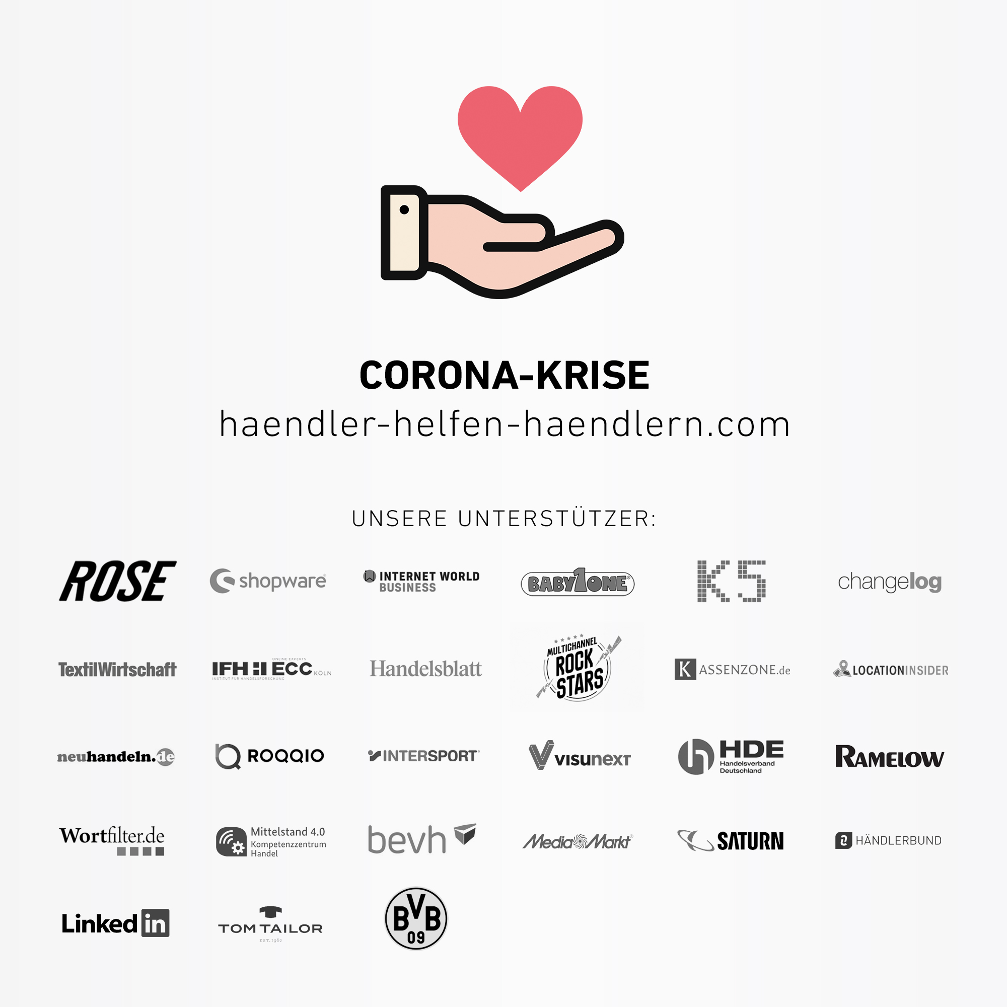 Die Initiative „Händler helfen Händlern“ startete am 19. März. Führende mittelständische Handelsunternehmen haben eine Gruppe auf der Karriereplattform LinkedIn ins Leben gerufen, die betroffene Unternehmer und Unternehmerinnen informiert und untereinander vernetzt. Die Gruppe zählt nach nur vier Tagen 800 Mitglieder, darunter Händler, Handels- und Wirtschaftsverbände, Journalisten und Handelsexperten. Händler wie Rose Bikes, MediaMarkt und Saturn sowie TomTailor, und Intersport unterstützen die Initiative.