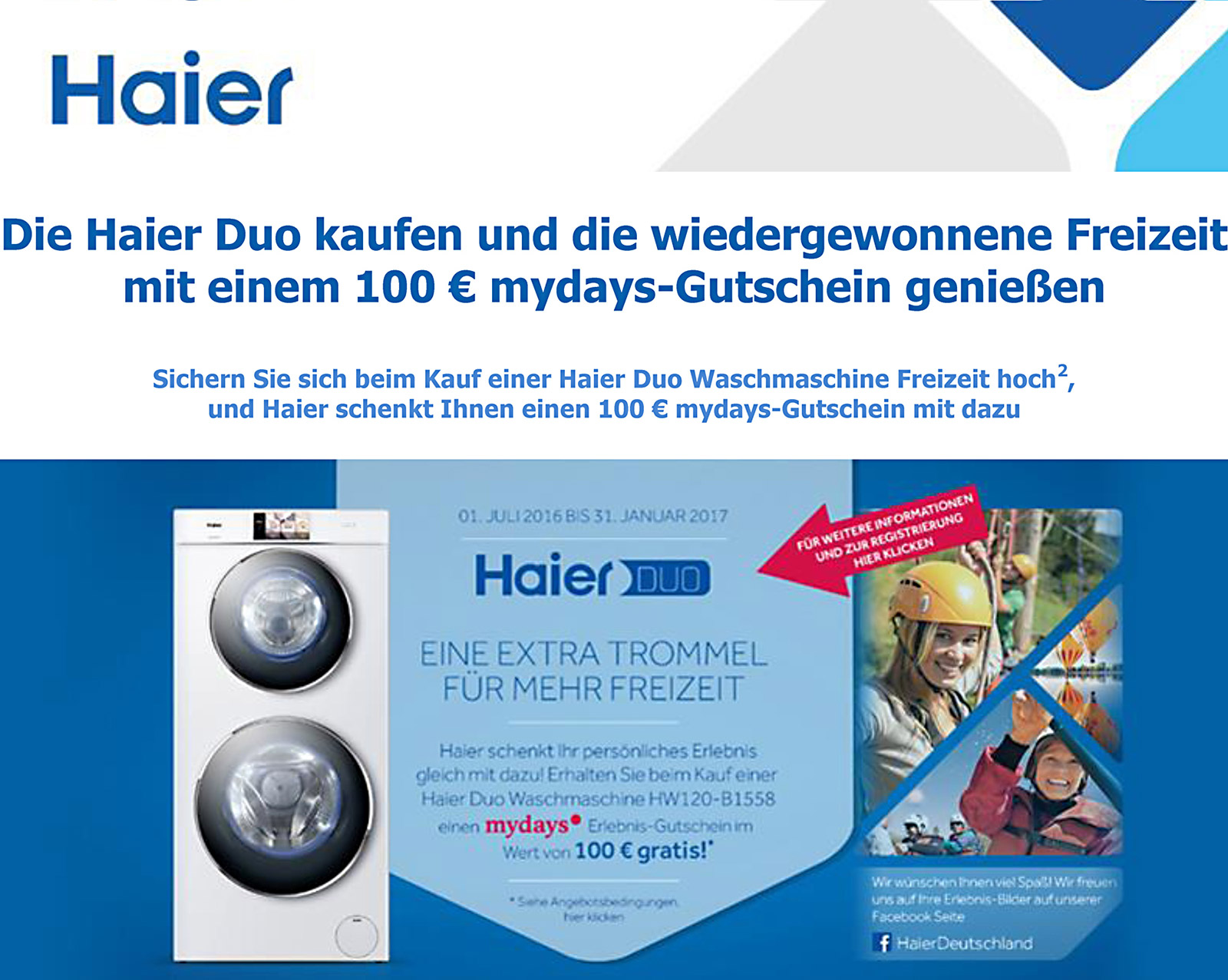 Haier promotet seine Waschmaschine Duo bis zum 31. Januar 2017 mit einem 100 € mydays-Gutschein. Mit der doppelten Waschtrommel entfällt das Warten auf das Ende des ersten Waschgangs, bevor der zweite mit anderen Farben oder Materialien gestartet werden kann. Die Duo (HW120-B1558) verfügt über zwei integrierte und beleuchtete Waschtrommeln, die je nach Bedarf unterschiedliche Waschprogramme entweder gleichzeitig oder separat absolvieren können. Kunden, die das Gerät kaufen, müssen sich spätestens bis zum 14. Februar 2017 online auf Markenmehrwert.com registrieren. Nach erfolgreicher Prüfung wird der mydays-Gutschein zugesendet.