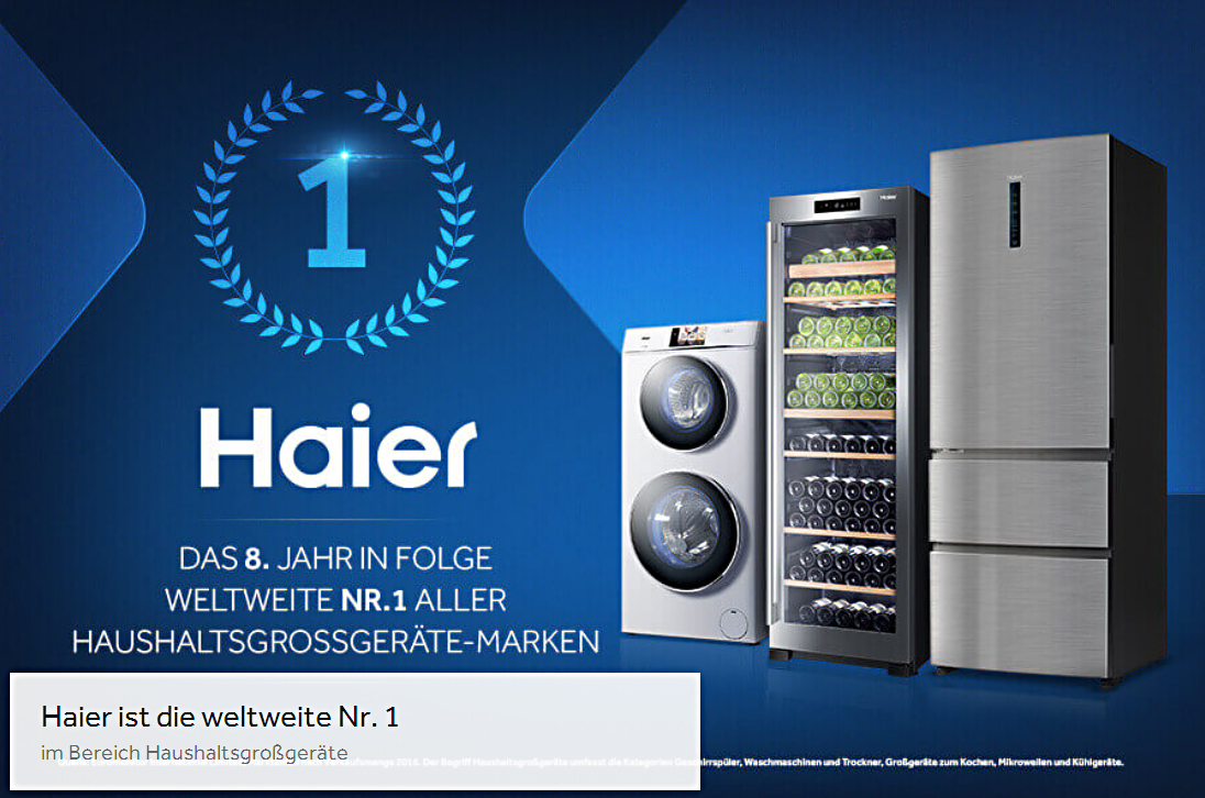 Laut Euromonitor 2017 ist Haier unter den Haushaltsgroßgeräte-Marken zum neunten Mal in Folge auf Volumenbasis die Nummer eins. Damit ist die Haier-Gruppe das weltweit führende (Produktions-) Unternehmen auf dem Gebiet der Haushaltsgroßgeräte (Geschirrspüler, Waschmaschinen, Trockner, Großgeräte zum Kochen, Mikrowellen, Kühlgeräte).