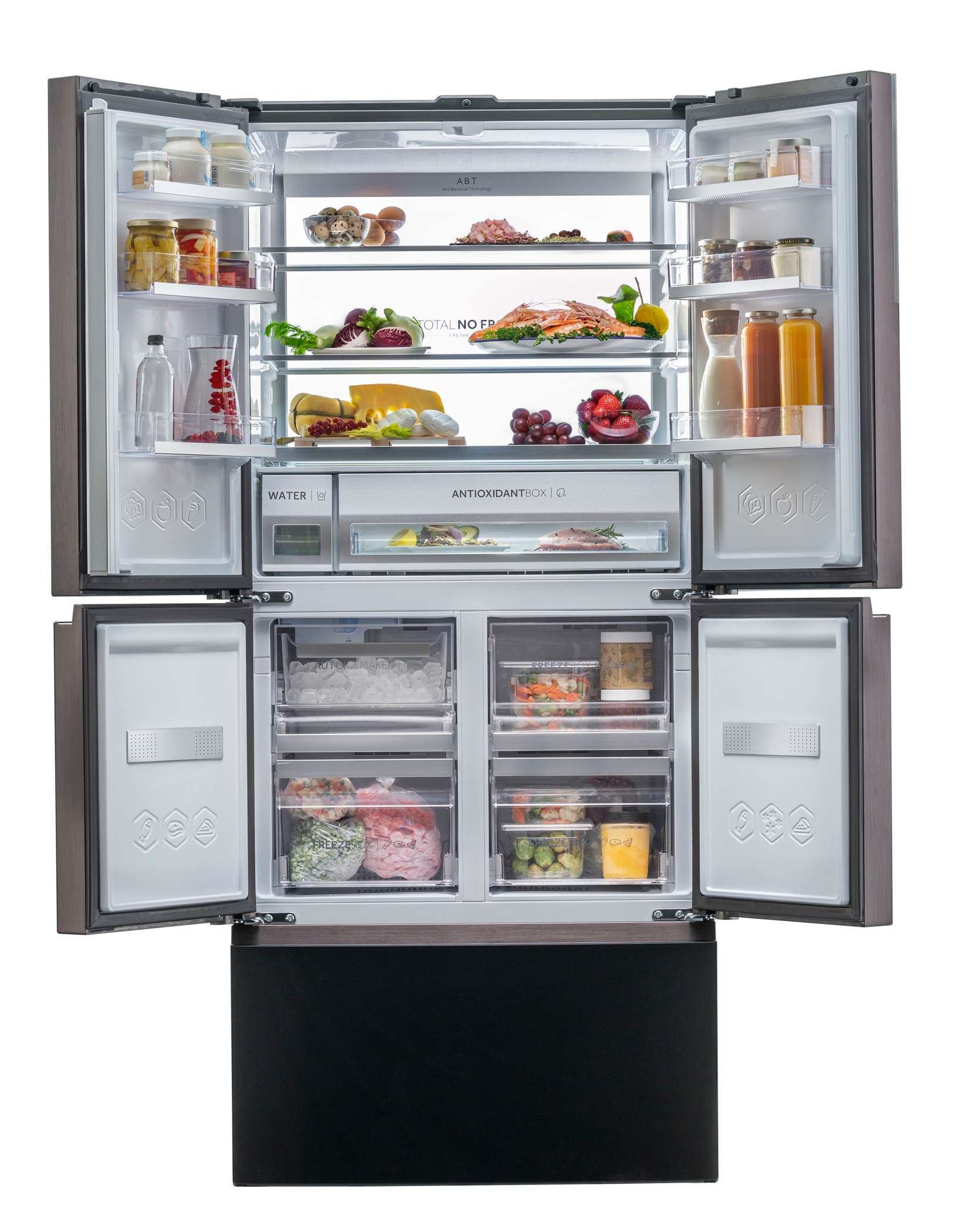 Die Haier Kühl- /Gefrierkombination F+ ist ein Kombigerät mit fünf Türen. Das Multi-Door-Gerät verfügt über Türen aus gehärtetem schwarzem Glas.