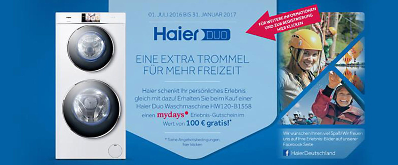 Haier promotet seine Waschmaschine Duo mit Doppeltrommel bis zum 31. Januar 2017 mit einem 100 € mydays-Gutschein. Mit der doppelten Waschtrommel entfällt das Warten auf das Ende des ersten Waschgangs, bevor der zweite mit anderen Farben oder Materialien gestartet werden kann. Die Waschmaschine Duo HW120-B1558 verfügt über zwei integrierte und beleuchtete Waschtrommeln, die je nach Bedarf unterschiedliche Waschprogramme entweder gleichzeitig oder separat absolvieren können. Kunden, die das Gerät kaufen, müssen sich spätestens bis zum 14. Februar 2017 online auf Markenmehrwert.com registrieren. Nach erfolgreicher Prüfung wird dann der mydays-Gutschein zugesendet.