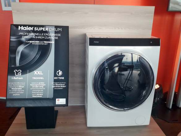 Haier indes atmet Premium (in der Siemens- und Samsung-Klasse), punktet im Handel wie beim Kunden mit maßgeschneiderten Lösungen und Top-Design. Ein klares Signal für die erfolgreiche Premium-Strategie ist beispielsweise der Preisindex von 157 bei Kühlgeräten. Größere Waschmaschinen, wie Haier sie produziert, liegen genauso im Trend wie Kühlgeräte mit größerem Volumen. Beide Modelle waren auf der Roadshow zu sehen. Für die neue Haier Waschmaschine aus der „Super Drum“-Serie, die bis zu 15 Kilogramm Wäsche fasst, gibt es erstmals TV-Werbung.