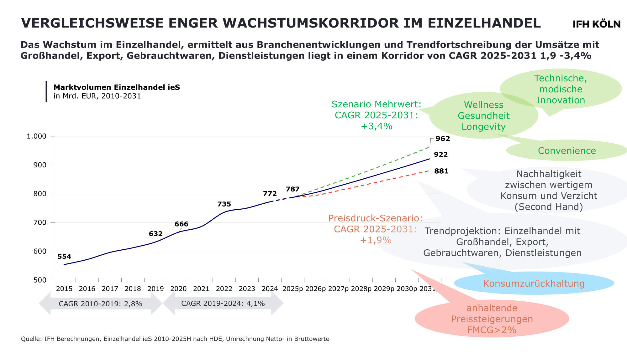 Für den Einzelhandel insgesamt sehen die Prognosen bis 2031 einen engen Wachstumskorridor von 1,9 bis 3,4 Prozent. Wachstum wird künftig weniger flächendeckend entstehen, sondern selektiv – getrieben von technischer Innovation, Convenience, Gesundheit & Longevity, Nachhaltigkeit und kanalübergreifenden Konzepten.