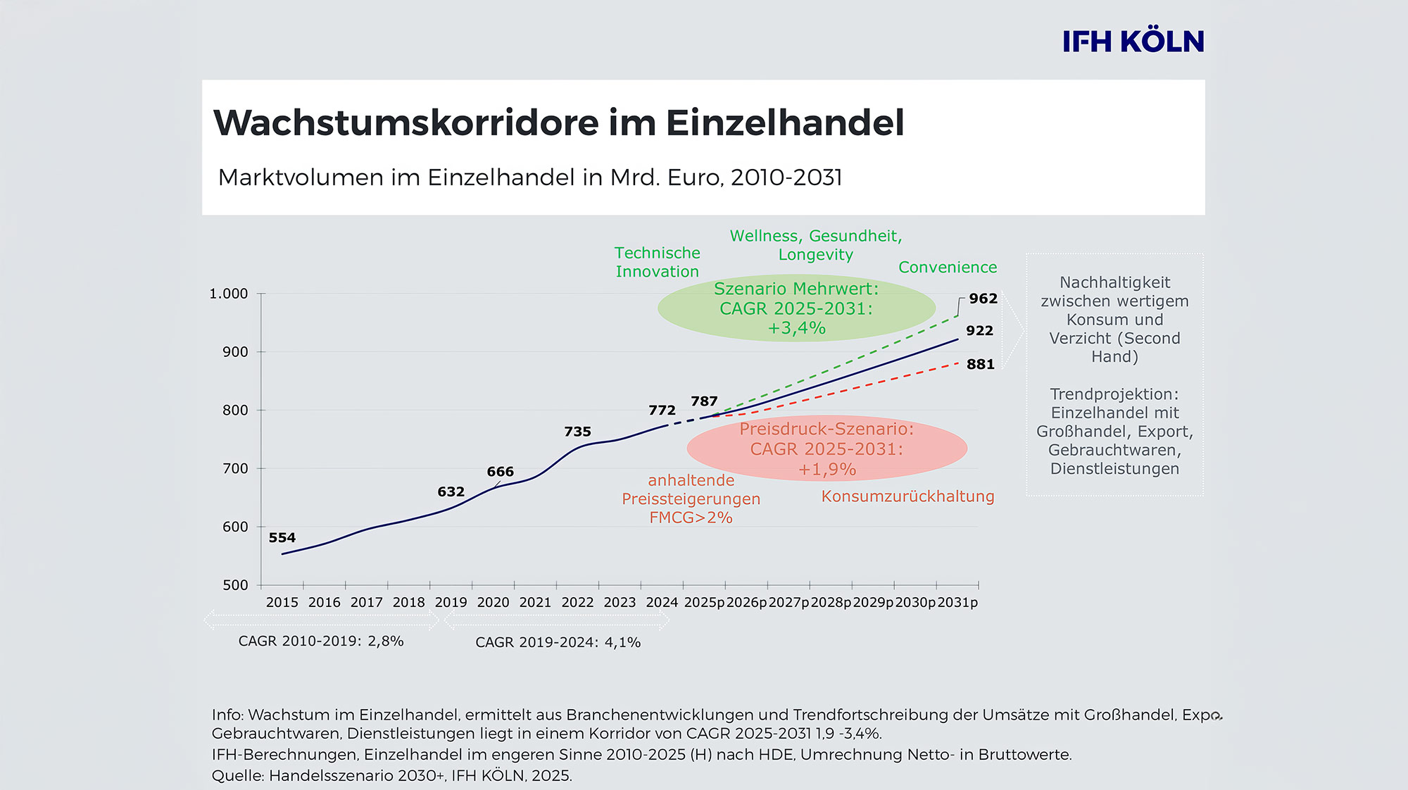 Das IFH Köln sieht im mehrwertorientierten Szenario die Notwendigkeit eines neuen Unternehmertums, das über reine Effizienzsteigerung hinausgeht. Erfolgreiche Handelsmodelle setzen auf eine enge Verbindung von Kundenerwartungen und Produktangebot. Trendthemen wie Gesundheit, Langlebigkeit, Nachhaltigkeit und Innovation gelten als zentrale Treiber – mit branchenspezifischen Ausprägungen.