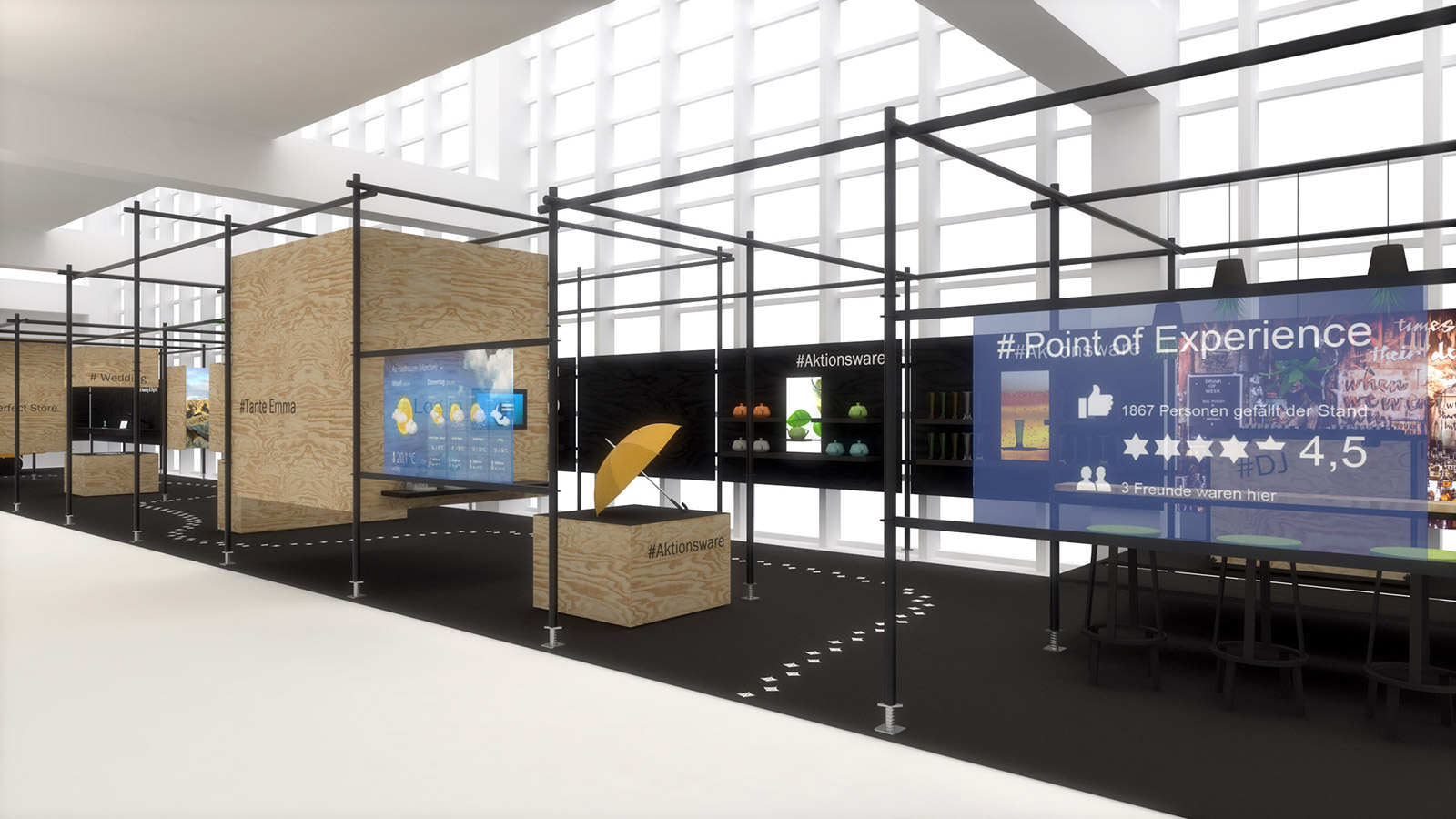 Die nächsten Schritte führen in die Check-In-Zone, wo Kurzfilme auf mehreren Bildschirmen unterschiedliche Aktionsware im Gebrauch zeigen. Teil des Eingangsbereichs ist außerdem eine Eventzone. Sie könnte im Live-Betrieb mit Verkostung, Musik oder Testaktionen die Aufmerksamkeit potenzieller Kunden einfangen.