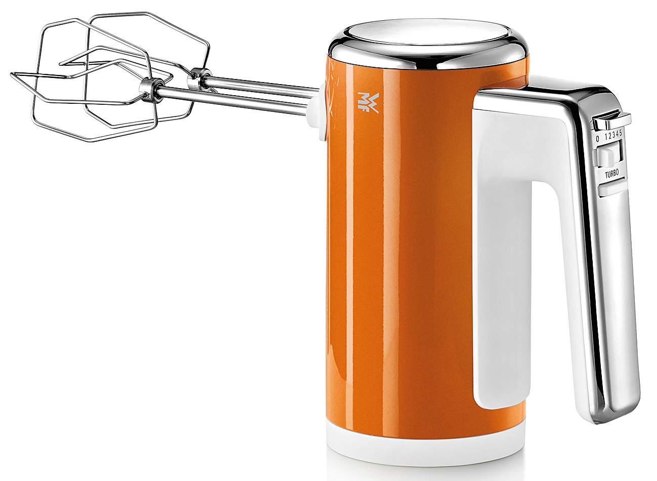 Der Handmixer WMF Edelrührer Lono ist in den Farben lemon green Metallic oder candy orange Metallic erhältlich. Zur Ausstattung gehören je zwei Cromargan Rührbesen und Knethaken. Mit fünf Geschwindigkeitsstufen kann man das gewünschte Tempo einstellen oder ihn mit Turbo-Funktion zu voller Stärke auflaufen lassen. 350 Watt Leistung und 1.300 Umdrehungen pro Minute stehen zum Kneten und Rühren zur Verfügung. Eine praktische Kabelklemme für die Fixierung beim Verstauen rundet die Ausstattung ab.