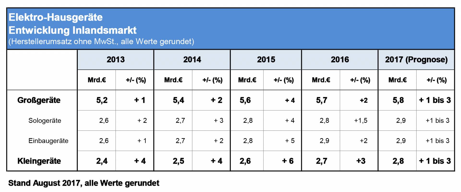 Trotz einer teilweise wechselhaften monatlichen Entwicklung kletterte der Herstellerumsatz mit Haushalt-Großgeräten in Deutschland im ersten Halbjahr 2017 um etwa zwei Prozent. In gleicher Größenordnung stieg auch der Umsatz mit kleinen Hausgeräten.