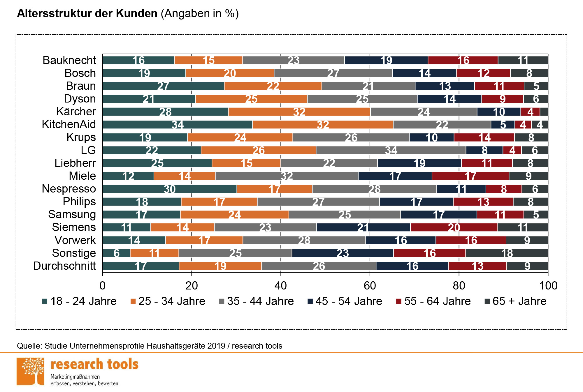 In der dritten Kennzahlengruppe, der Kundenstruktur, ist Miele einer der Branchenbenchmarks. Mit einer Kundenausschöpfung von 68 Prozent ist Miele in dieser Disziplin die erfolgreichste Marke. Zudem verfügt die Marke über den höchsten Anteil an Kunden mit einem jährlichen Haushalts-Bruttoeinkommen von über 60.000 Euro. Ganz anders dagegen die Marke KitchenAid. Sie verfügt über einen Anteil von 65 Prozent an Kunden unter 35 Jahre.