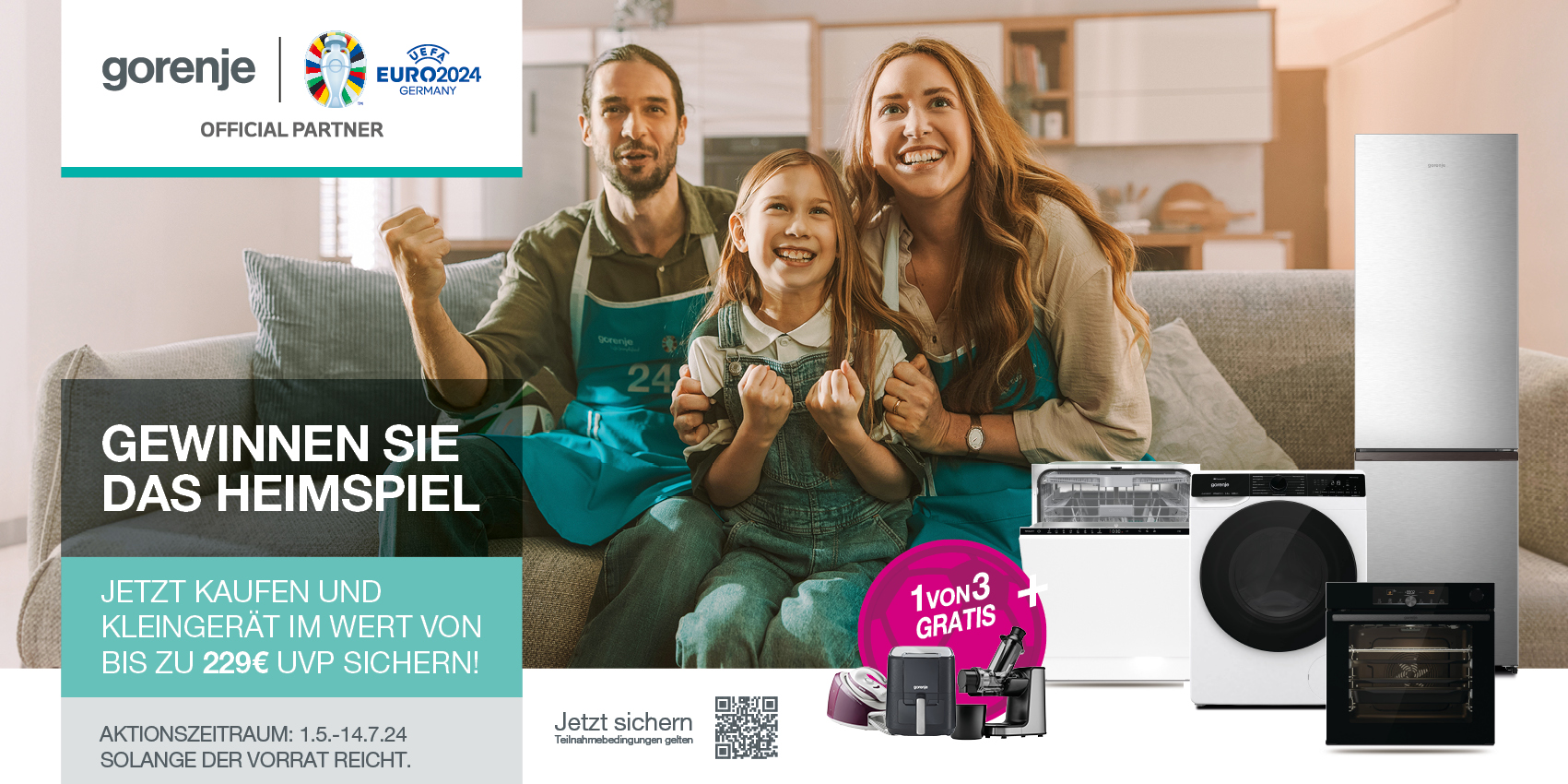 Beim Kauf eines der ausgewählten Aktions-Modelle bis14.7.2024 erhalten die Kunden ein Gorenje Kleingerät im Wert von bis zu 229 EUR UVP gratis dazu. Zur Wahl stehen ein Slow Juicer, ein Dampfbügeleisen und eine Heißluftfritteuse. Die Umsetzung ist für Kunden und Händler denkbar einfach: Nach dem Kauf bei einem der teilnehmenden Händler können sich die Kunden auf der Landing Page mit allen relevanten Daten selbst registrieren, ihr Wunsch-Gerät auswählen und erhalten es dann zugeschickt.