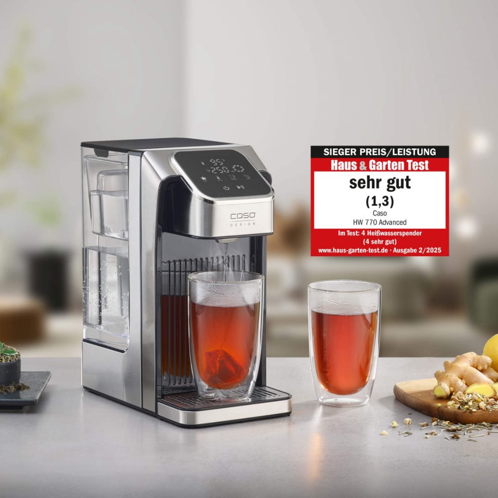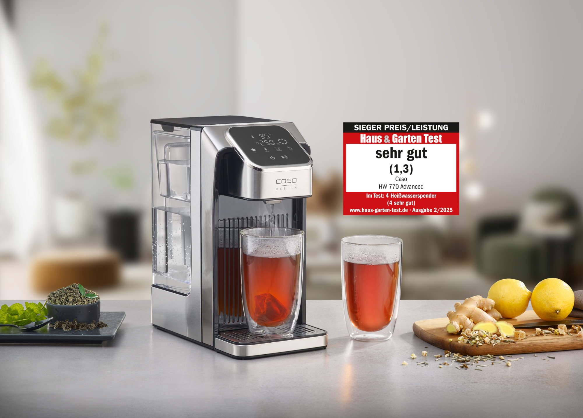 Das Magazin Haus & Garten Test hat in der aktuellen Ausgabe 02/2025 verschiedene Heißwasserspender geprüft. Zwei Geräte der Marke Caso Design erhielten die Bewertung „sehr gut“. Der HW 1660 wurde zum Testsieger ernannt, der HW 770 Advanced zum Preis-Leistungs-Sieger.