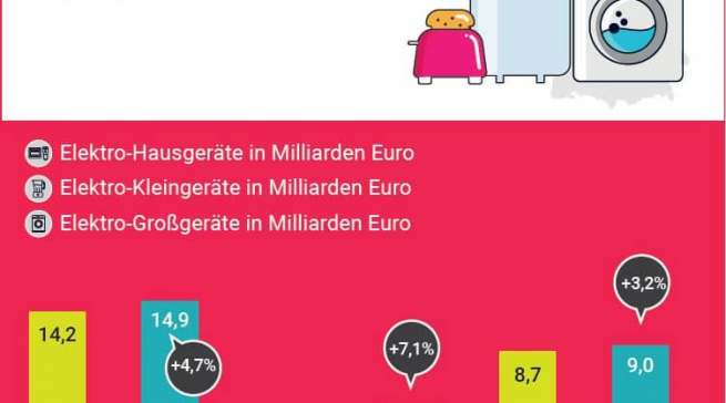 Elektro-Hausgeräte verzeichneten einen gestiegenen Umsatz auf jetzt 14,9 Mrd. EUR, ein Plus von 4,7%. Die Produktsparte Elektro-Großgeräte konnte 2019, nach einem einmaligen Rückgang im Vorjahr, mit 3,2 % auf neun Milliarden Euro wachsen und so wieder an die mehr als zehnjährige Erfolgsgeschichte anknüpfen. Mit Elektro-Kleingeräten wurde 2019 mit einem Plus von 7,1 % auf knapp 5,9 Mrd. EUR erneut eine Umsatzsteigerung erreicht. Auch diese positive Entwicklung ist seit mehr als zehn Jahren stabil.