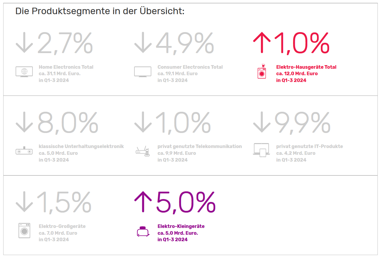 Erfreuliches gibt es indes aus den Bereichen der Elektro-Hausgeräte zu berichten. Das Segment der Elektro-Kleingeräte entwickelte sich in den letzten drei Quartalen 2024 mit 5% positiv zum Vorjahr und kann eine Umsatzsteigerung auf knapp 5 Mrd. EUR verbuchen. Zudem wurde der Abwärtstrend im Elektro-Großgeräte-Bereich deutlich gebremst und verringerte sich von minus 8,2% im vergleichbaren Vorjahreszeitraum auf nur noch minus 1,5%.