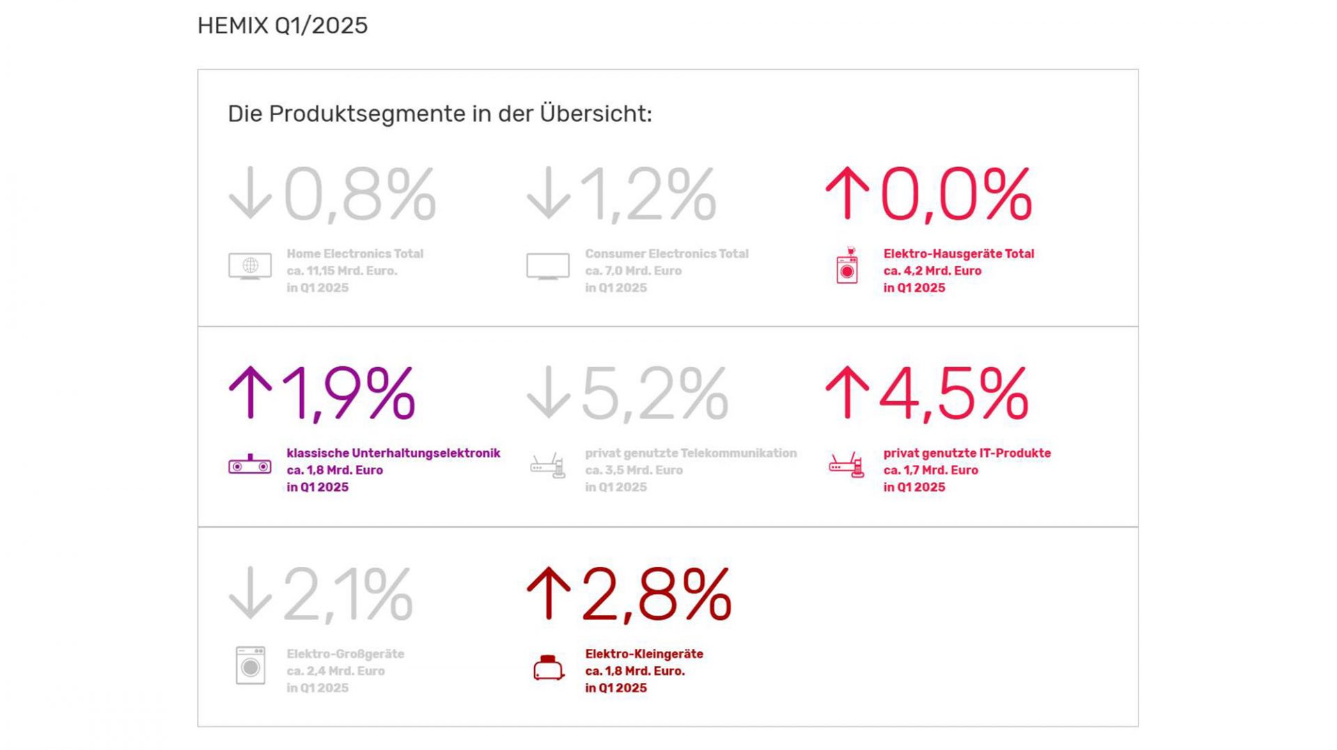 Der Home Electronics Market Index (HEMIX) zeigt für das erste Quartal 2025 eine leicht rückläufige Entwicklung im deutschen Markt für Home Electronics-Produkte. Im Zeitraum Januar bis März wurde ein Gesamtumsatz von rund 11,15 Milliarden Euro erzielt – ein Minus von 0,8 Prozent im Vergleich zum Vorjahreszeitraum.