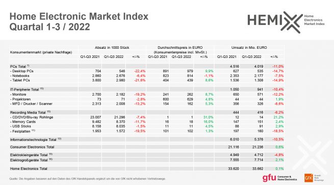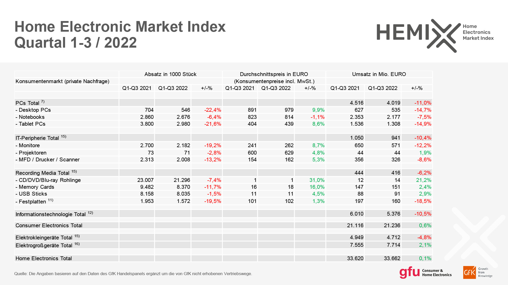 Der Markt für Home Electronics-Produkte, dargestellt im HEMIX, Home Electronics Market Index, zeigt sich in den ersten drei Quartalen 2022 verglichen mit dem Vorjahres-Zeitraum recht stabil (+ 0,1%). In den Monaten Januar bis September 2022 wurde ein Gesamt-Umsatzvolumen von knapp 33,7 Mrd. EUR erzielt.