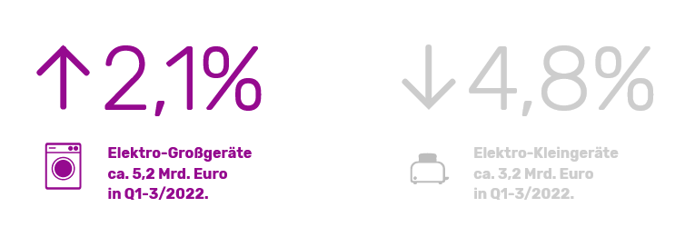 Die beiden Elektro-Hausgeräte-Segmente entwickelten sich dabei zwischen Januar und September 2022 erneut sehr unterschiedlich: Elektro-Großgeräte konnten einen, allerdings abgeschwächten, Umsatzzuwachs von 2,1% auf über 7,7 Mrd. EUR erzielen. Elektro-Kleingeräte indes waren mit einem Umsatzminus von 4,8% (mehr als 4,7 Mrd. EUR) rückläufig.