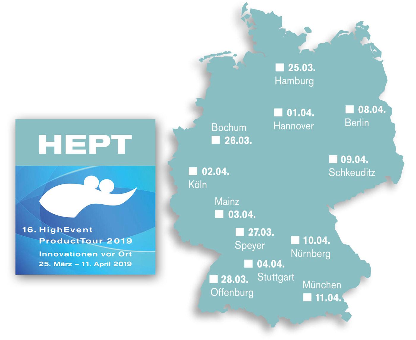 Ab dem 25. März ist die HighEventProductTour (HEPT) erneut auf großer Deutschlandreise und macht in ihrer 16. Auflage Station in zwölf Städten. Neben Beurer, Jura, Jura Gastro, Kärcher, Miele und Remington/Russell Hobbs freut sich in diesem Jahr erstmals auch Liebherr auf zahlreiche Fachbesucher. Wie immer erwartet die Gäste eine Vielzahl frischer Innovationen und Produkt-Highlights, kombiniert mit der Möglichkeit, sich im direkten Gespräch mit zahlreichen Unternehmensvertretern über Trends und Vertriebskonzepte auszutauschen.