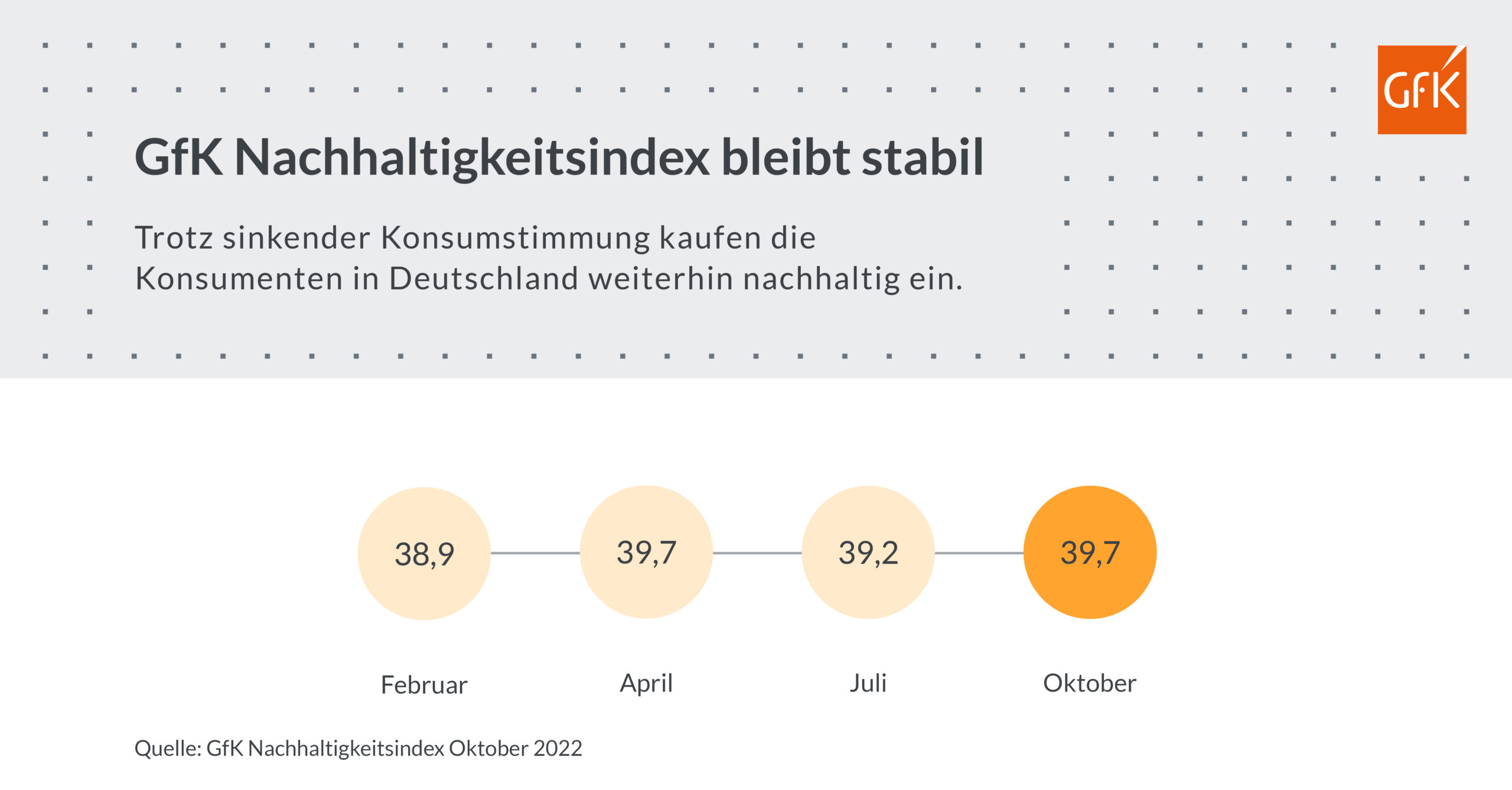 Trotz der anhaltenden Krisen ist Nachhaltigkeit für die Konsumenten in Deutschland weiterhin relevant: Das zeigt der GfK Nachhaltigkeitsindex für Oktober 2022. Mit einem aktuellen Wert von 39,7 bleibt der Index stabil und ist nach einem etwas niedrigeren Wert von 39,2 im Juli sogar wieder auf das Niveau von April 2022 gestiegen.