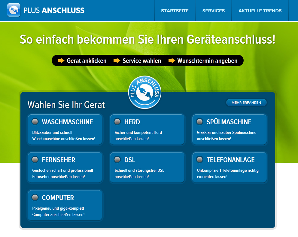 Einfach nur auf www.plusanschluss.de die Gerätegruppe, die Serviceleistungen, Zusatzleistungen und den Wunschtermin auswählen. Mit dem abschließenden Klick wird der nächstgelegene, an dem System teilnehmende Händler informiert. Dieser wiederum meldet sich zur Terminbestätigung unverzüglich zurück.