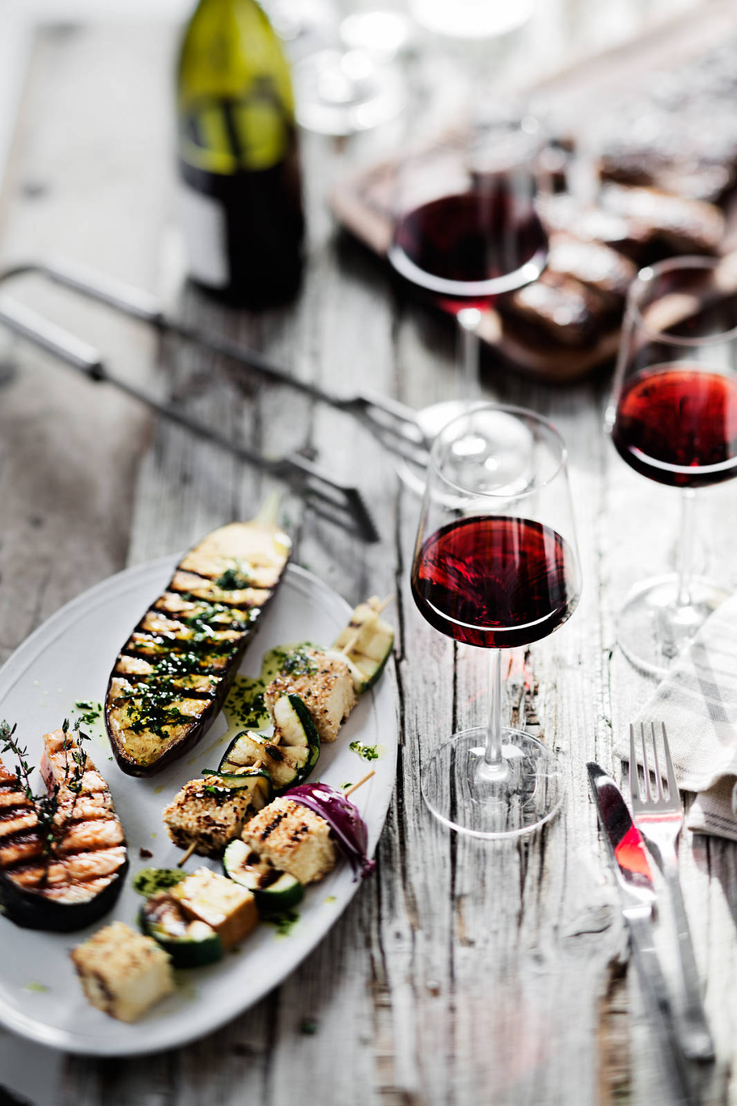 Zu vegetarischen und veganen Leckereien ist der Silvaner ein guter Begleiter, ebenso wie Müller-Thurgau oder Grauburgunder. Mit ihren dezenten Aromen holen sie das Beste aus dem Gemüse hervor. Und auch hier gilt: Trockener Rosé geht immer. Hervorragend zum Grillen geeignet sind zum Beispiel Auberginen oder Austernseitlinge, auf dem Teller mit Hummus oder Tsatsiki angerichtet. Ebenso Gemüsespieße, beispielsweise mit Kirschtomaten, dicken Zucchinischeiben, Paprikastreifen und Tofu.