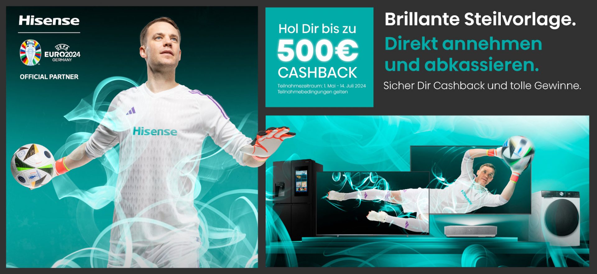 Wer eines der Aktions-Modelle bei einem der teilnehmenden Händler kauft, kann sich bis zu 500 EUR Cashback sichern. Die Online-Registrierung erfolgt auf der Landing Page und eröffnet gleichzeitig einzigartige Gewinnchancen. Unter allen Registrierungen verlost Hisense Tickets für die UEFA EURO 2024, handsignierte Merchandise-Artikel, offizielle UEFA-Fußbälle, Fan-Pakete, Hisense Bierspender und Hisense TVs. Schnell sein lohnt sich: Die begehrten EM-Tickets werden bereits am 3. Juni 2024 verlost. Details zur Cashback-Aktion finden Sie hier.