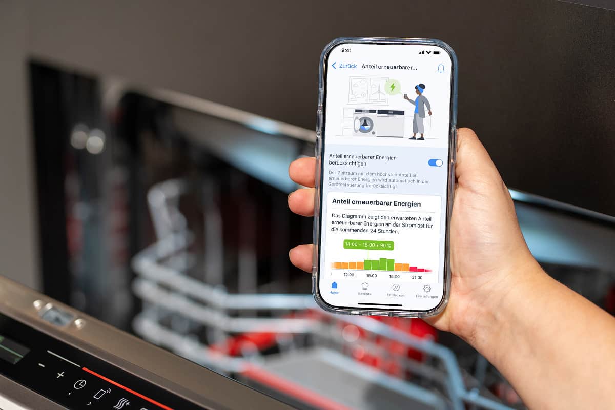 Dank des neuen Features „Smart Start“ können Nutzer nun auf einfache Weise den Anteil erneuerbarer Energien für die Nutzung ihrer Hausgeräte maximieren. Sie können Home Connect-fähige Geschirrspüler, Waschmaschinen, Trockner oder Waschtrockner automatisiert genau zu der Tageszeit starten lassen, wenn der Anteil erneuerbarer Energien im Stromnetz besonders hoch ist.