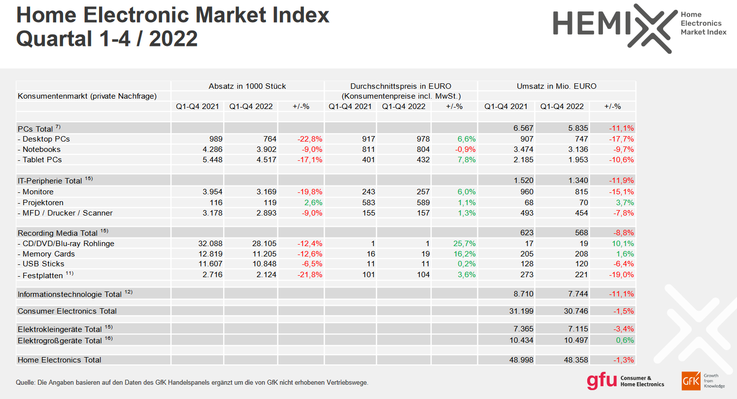 Die Marktzahlen der HE-Branche werden von der Branchenorganisation gfu sowie der GfK gemeinsam einheitlich für alle Marktteilnehmer in Form des offiziellen Home Electronics Market Index Hemix erhoben. Der Hemix zeigt auf Basis Menge und Wert die quartalsweise Marktentwicklung in Deutschland auf.