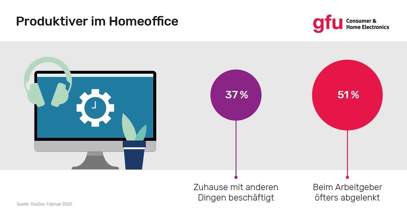 Unter dem Strich scheint die Arbeit im Homeoffice produktiver zu sein. Zwar sagen 37% der im Homeoffice Arbeitenden, sie seien zuhause häufiger mit anderen Dingen beschäftigt, aber die Mehrheit von 51% fühlt sich im Büro beim Arbeitgeber häufiger abgelenkt.