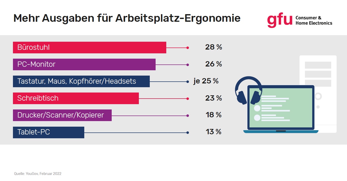 Wer sich dauerhaft im Homeoffice einrichtet, kommt an Investitionen nicht vorbei. Während vor einem Jahr gerade 55% der von zu Hause aus Arbeitenden angaben, dass sie in die Ausstattung des Homeoffice investiert hätten, liegt dieser Wert aktuell bei 70%. Für einen überschaubaren Zeitraum mit Bordmitteln zu arbeiten mag funktionieren. Längerfristig ist Ergonomie bei der Arbeit jedoch ein wichtiger Aspekt in Hinblick auf Gesundheit und Produktivität.