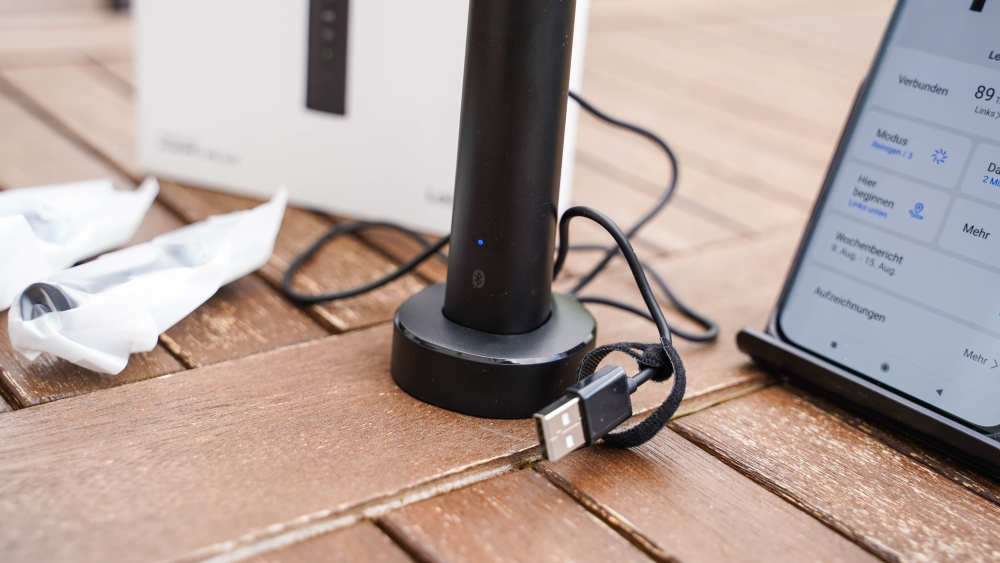 Der Charger lädt, wie bei vielen elektrischen Zahnbürsten kabellos. Leider unterstützt die Huawei Lebooo Smart Sonic Zahnbürste keine Qi Ladetechnik. Auch wenn es schön gewesen wäre unterwegs nicht auf den beiliegenden Charger angewiesen zu sein und das Smartphone zum Laden zu nutzen, kann man das aber aufgrund des riesigen 2500 mAh Akkus verkraften. Rund 90 Tage je zweimal Putzen hält sie durch. Das ist deutlich länger als bei den meisten elektrischen Zahnbürsten. Schade finde ich nur, dass kein Netzteil enthalten ist. Zwar ist USB ganz nett um unterwegs am Laptop zu laden, aber die meisten Leute haben vermutlich keine USB-Steckdosen im Bad. Niemand möchte mit der Zahnbürste bzw. dem Netzteil des Smartphones zwischen Bad und Zimmer pendeln. Insgesamt muss der große Akku etwa 8 Stunden laden.