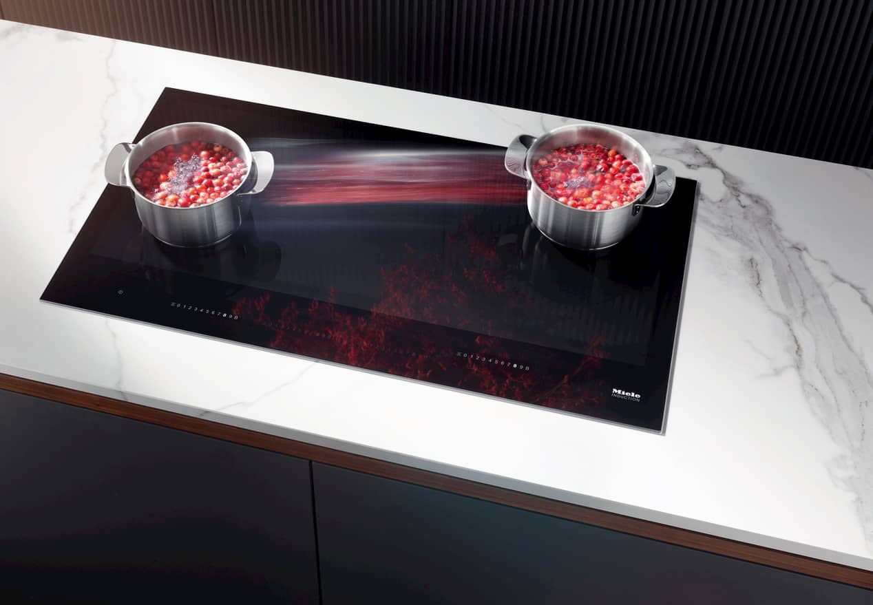 Wer nach mehr Flexibilität und Intuition beim Kochen sucht, für den ist bei Kochfeldern die Vollflächeninduktion das Nonplusultra. Beim KM 7897 FL lassen sich auf 90 Zentimeter Breite bis zu sechs Töpfe oder Pfannen beliebig auf der gesamten Fläche positionieren und bei Bedarf auch verrücken. So passt sich die Miele-Vollfläche der Köchin oder dem Koch an und nicht umgekehrt.