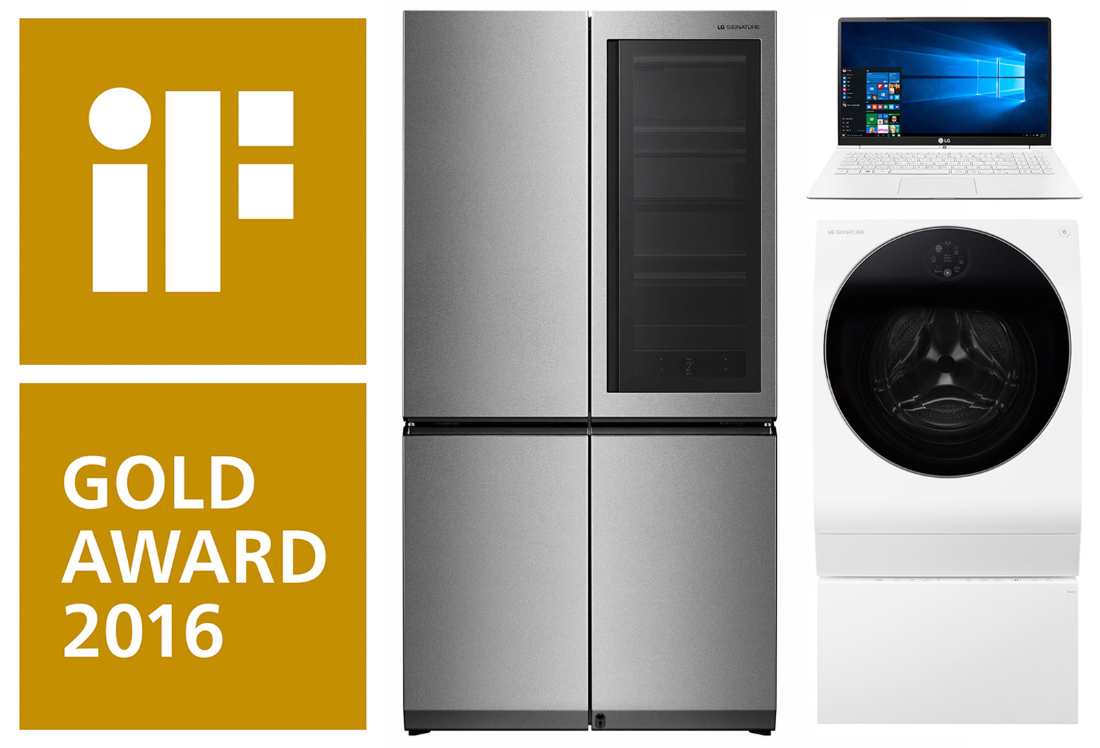 LG hat gleich 28 der diesjährigen iF Design Awards erhalten, mehr als jedes andere koreanische Unternehmen zuvor. Gleich drei der LG-Produkte wurden zudem mit dem besonders begehrten iF Gold Award ausgezeichnet; u.a. der Signature Kühlschrank sowie die Signature Waschmaschine wurden als Beste ihrer Kategorie geehrt. Die Waschmaschine zeichnet sich durch ein Design aus, bei dem ein 12 kg Frontlader mit einer 2 kg Mini Waschmaschine im unteren Teil des Gerätes kombiniert wurde. Das Gerät weist eine Zahl besonderer Ausstattungsmerkmale auf, beispielsweise eine Tür aus Hartglas und ein rundes, 7 Zoll großes Touch Display, gefasst in Emaille.