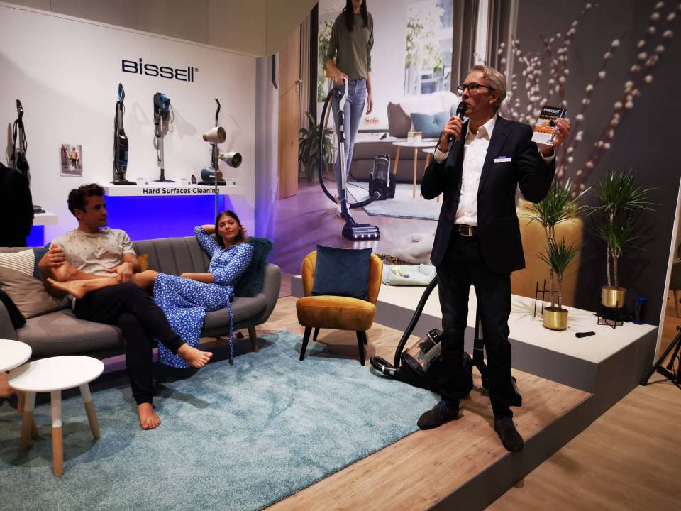 Ganz anders beim Boom-Thema Bodenpflege, genauer in den Segmenten Saugroboter und Akku Handstaubsauger: Hier sorgen neue Player wie Bissell (der Messe-Auftritt brachte Farbe und bestes Infotainment in die Halle 9), die Amerikaner von SharkNinja, Zaco oder Blaupunkt Robotics für Aufmerksamkeit.