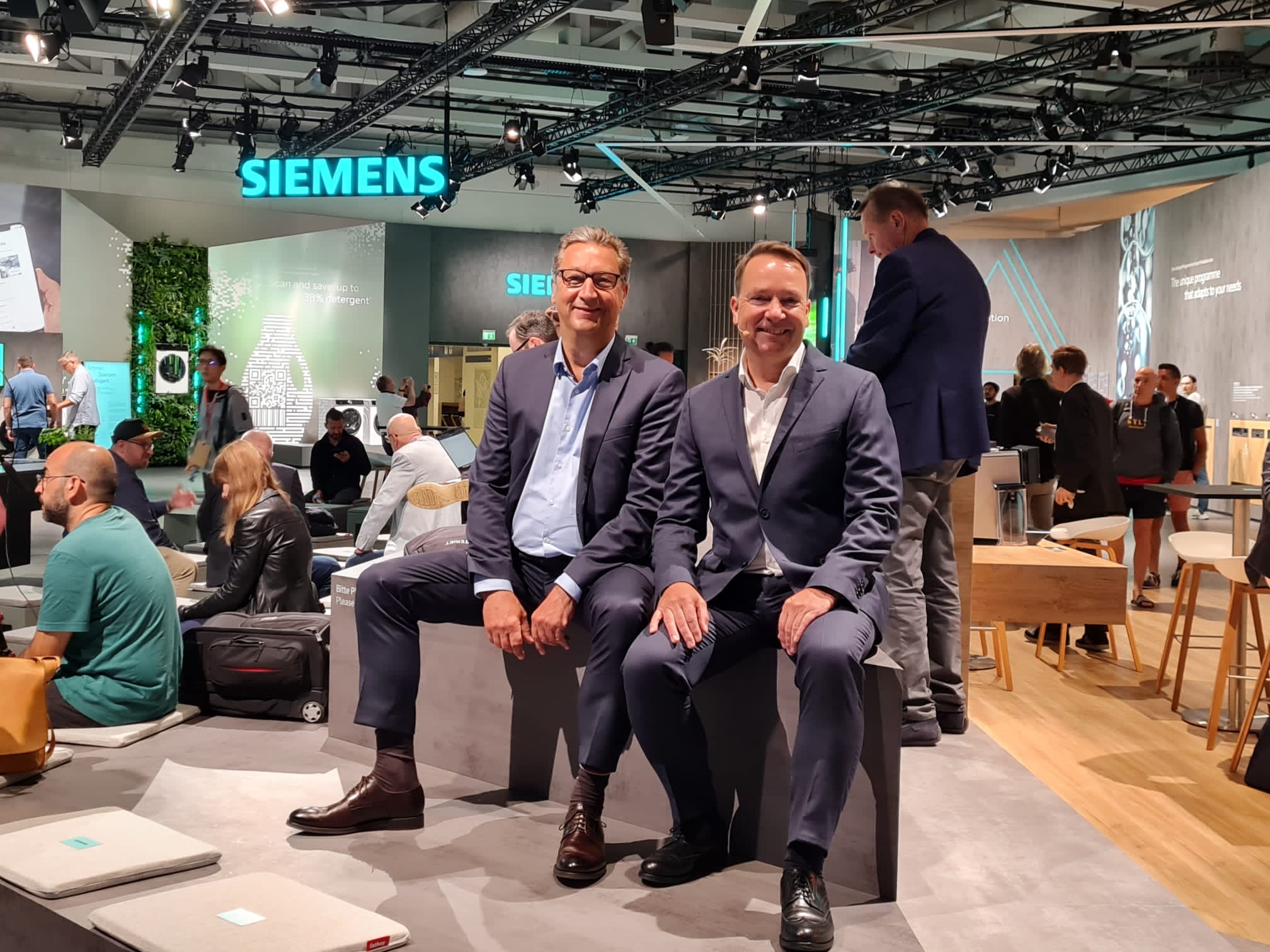 Die Reihe der IFA-Pressekonferenzen begann am Mittwoch auf dem Stand von Siemens. Unser Foto zeigt v.l. Harald Friedrich, Leiter Vertrieb Zentral- und Osteuropa der BSH und Siemens Geschäftsführer Michael Mehnert. Fotos: G. Wagner, IFA Management, M. Machan