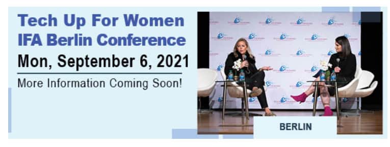 Die IFA veranstaltet am 6. September 2021, in Zusammenarbeit mit der Global Training Events Group, die erste internationale Tech Up For Women-Konferenz. Die B2B-Veranstaltung ermöglicht es Frauen, von weiblichen Führungskräften, Forschern und Experten zu lernen und mit ihnen in Kontakt zu treten.