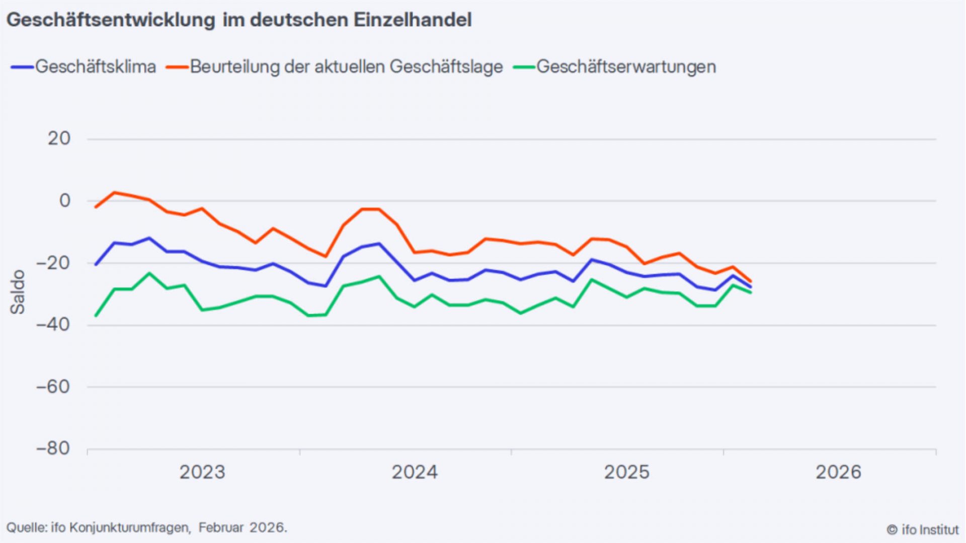 Die Stimmung im deutschen Einzelhandel hat sich im Februar weiter eingetrübt. Das ifo Geschäftsklima fiel auf -27,7 Punkte, nach -24,1 Punkten im Januar. Vor allem die Bewertung der aktuellen Geschäftslage verschlechterte sich spürbar, während auch die Erwartungen für die kommenden Monate weiterhin gedämpft bleiben.