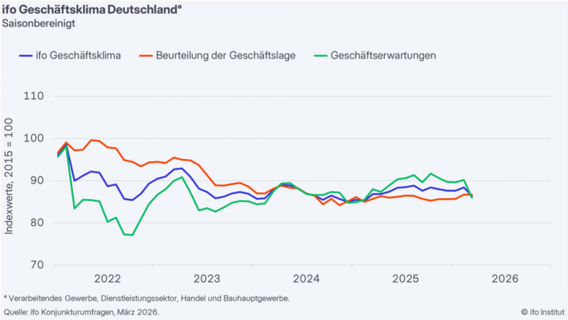 Die wirtschaftliche Stimmung in Deutschland hat sich im März deutlich eingetrübt. Wie das Ifo Institut mitteilt, sank der Geschäftsklimaindex auf 86,4 Punkte – nach 88,4 im Vormonat. Hauptursache sind deutlich pessimistischere Erwartungen der Unternehmen, während die aktuelle Geschäftslage stabil bewertet wurde. Gleichzeitig nimmt die Unsicherheit in der Wirtschaft spürbar zu, nicht zuletzt vor dem Hintergrund geopolitischer Entwicklungen.
