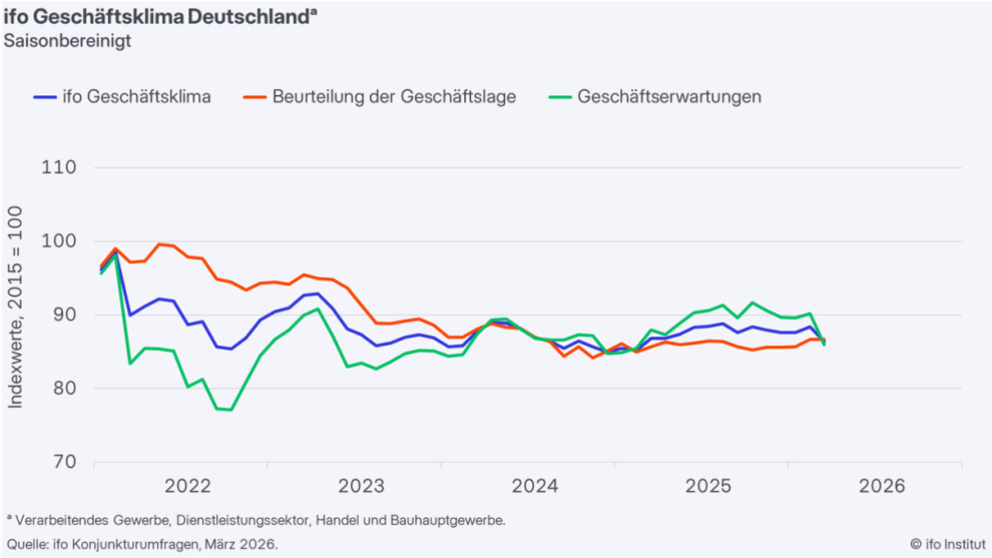 Die Stimmung in der Wirtschaft hat sich im März deutlich eingetrübt. Der Geschäftsklimaindex sank auf 86,4 Punkte – nach 88,4 im Vormonat. Quelle: Ifo Institut