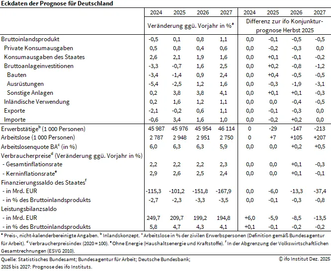 Die Arbeitslosigkeit soll laut ifo Prognose 2025 um 161.000 Personen auf 6,3 % steigen. Für 2026 wird mit einer Stagnation, für 2027 mit einem leichten Rückgang auf 5,9 % gerechnet. Die Inflationsrate bleibt in allen drei Jahren leicht über der Zielmarke der Europäischen Zentralbank: 2025 und 2026 bei jeweils 2,2 %, 2027 bei 2,3 %. Während die Energiepreise sinken, halten Dienstleistungspreise und Lohnkosten die Kerninflation über 2 %.