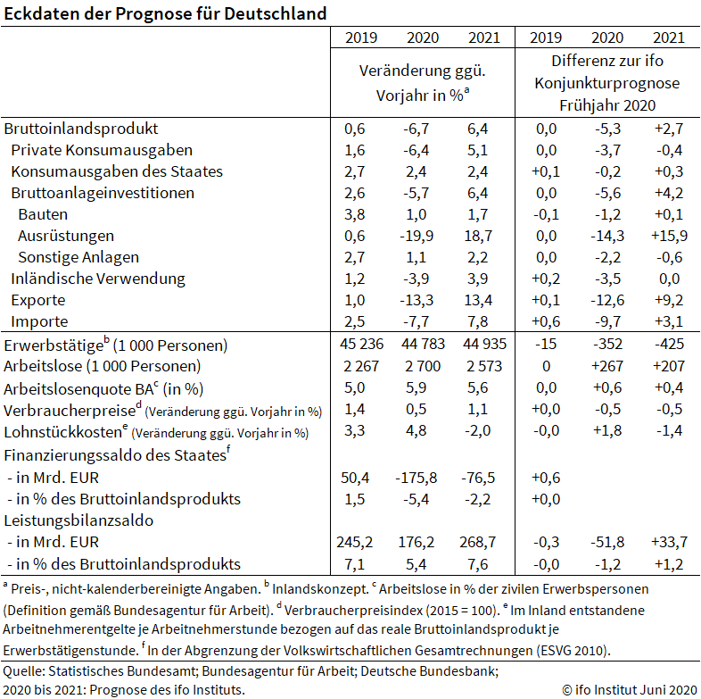 Die Zahl der Arbeitslosen wird im Jahresdurchschnitt von 2,3 Mio. auf 2,7 Mio. steigen. Im nächsten Jahr hingegen wird sie auf 2,6 Mio. sinken. Damit steigt die Arbeitslosenquote laut Prognose von 5,0 auf 5,9%, um 2021 dann auf 5,6% zu fallen. Die Zahl der Kurzarbeiter ist nach Berechnungen des ifo Instituts von Mai auf Juni 2020 von 7,3 Mio. auf 6,7 Mio. gesunken. Die Zahl der Beschäftigten wird im Jahresschnitt von 45,2 Mio. auf 44,8 Mio. diesem Jahr sinken, im kommenden Jahr wieder leicht auf 44,9 Mio. steigen.