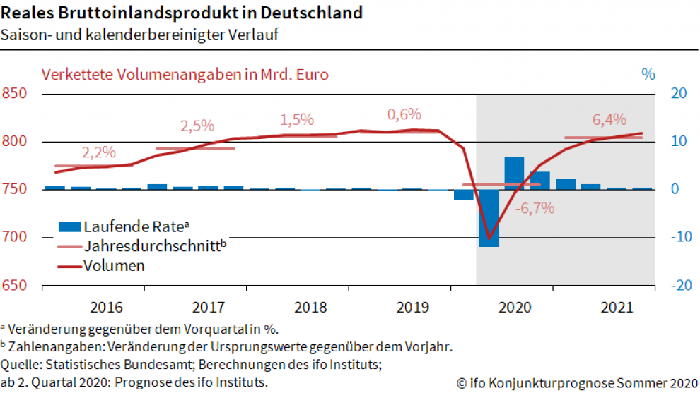 Das ifo Institut erwartet für die deutsche Wirtschaft einen Aufstieg aus dem Corona-Tal. Nachdem die Wirtschaftsleistung im ersten Vierteljahr um 2,2% zurückgegangen ist und 11,9% im zweiten Quartal, sieht das ifo Institut ein Wachstum von 6,9% im dritten und von 3,8% im letzten Vierteljahr. „Von nun an geht es schrittweise wieder aufwärts“, sagt ifo-Konjunkturchef Timo Wollmershäuser. Die Prognose beruht allerdings auf Annahmen über den weiteren Verlauf der Epidemie und die politischen Reaktionen darauf. Eine hohe Unsicherheit bleibt also bestehen.