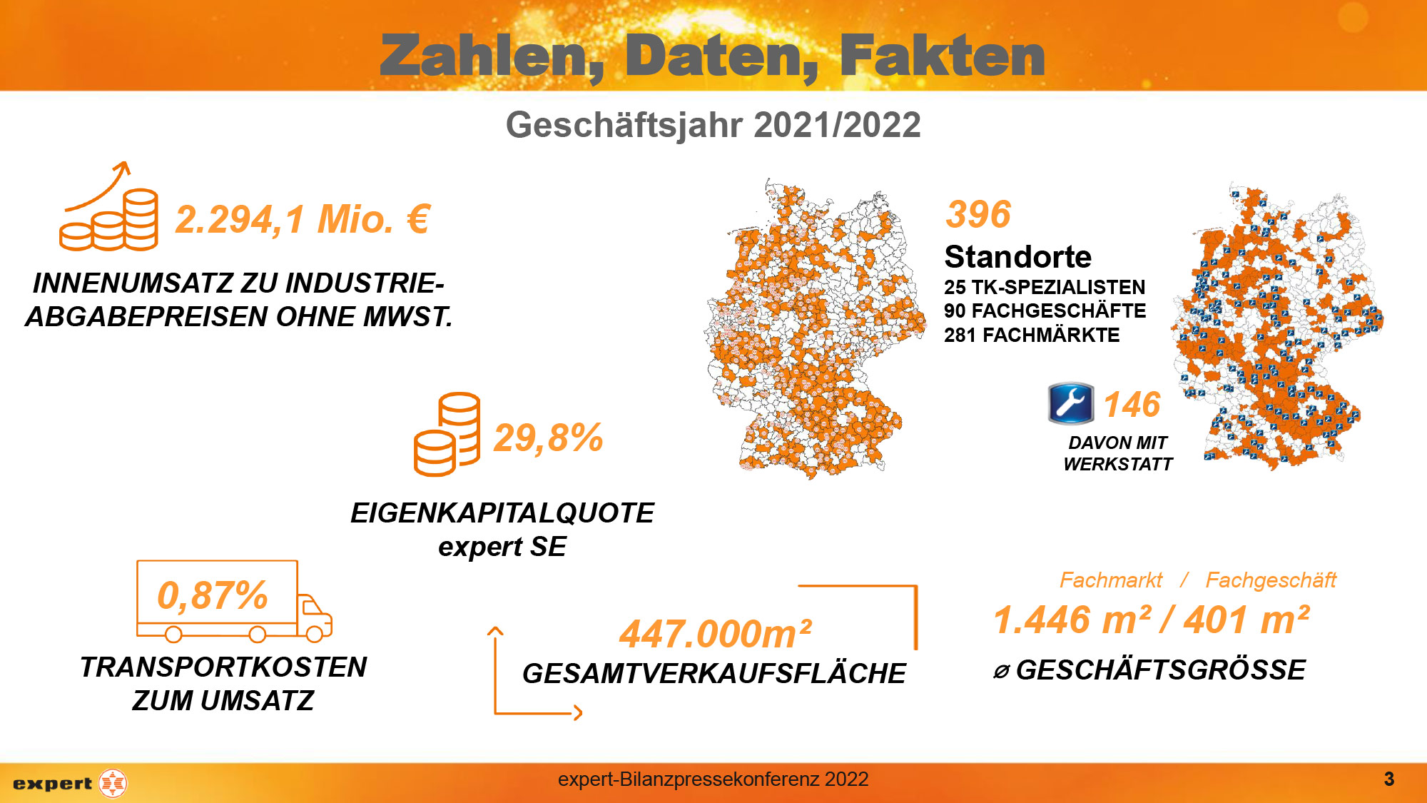 Im abgelaufenen Geschäftsjahr zählte die expert-Gruppe 199 Gesellschafter mit 396 Standorten, 146 davon betreiben eine eigene Service-Werkstatt. Die Anzahl der Fachmärkte ist gewachsen und betrug zum Geschäftsjahresende 281. „Wir haben unser Fachmarktnetzwerk durch erfolgreiche Nachfolgeregelungen und Expansion weiter gestärkt. Es zeigt sich, dass unsere strategische Ausrichtung die Bedürfnisse unserer Kunden und Gesellschafter trifft. Sie legt die Weichen für die nächsten Jahrzehnte expert-Erfolgsgeschichte“, so Dr. Stefan Müller.