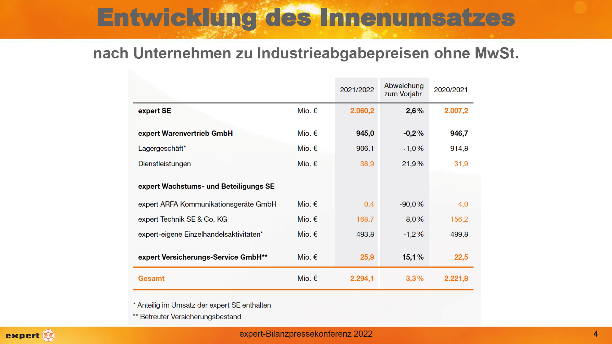 Im expert-Geschäftsjahr 2021/2022 (1.4.2021 bis 31.3.2022) erzielte die expert-Gruppe einen Innenumsatz zu Industrieabgabepreisen ohne Mehrwertsteuer in Höhe von 2,3 Mrd. EUR und lag damit um 3,3% über dem Vorjahreswert. Mit diesem positiven Ergebnis konnte expert seine Marktposition weiter ausbauen.