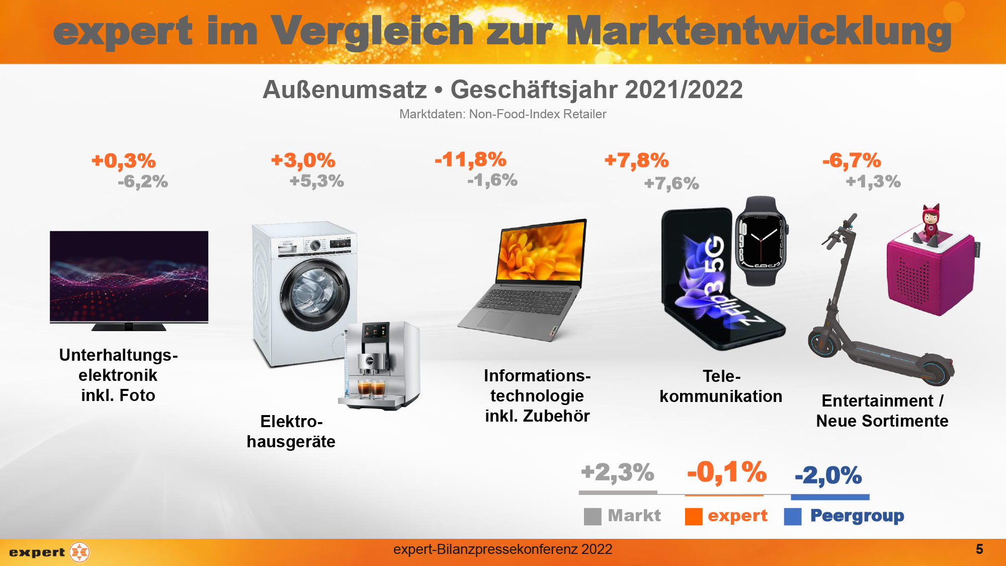 Zu Beginn des abgelaufenen Geschäftsjahres war der Betrieb der expert-Standorte noch stark von der Corona-Pandemie beeinflusst. Im Laufe der zweiten Jahreshälfte 2021 kamen mit der steigenden Inflation und den zunehmenden Preissteigerungen weitere Herausforderungen hinzu, die die Branche bis heute prägen. Trotz dieser einflussreichen Umstände entwickelte sich der expert-Außenumsatz auf dem sehr hohen Vorjahresniveau.