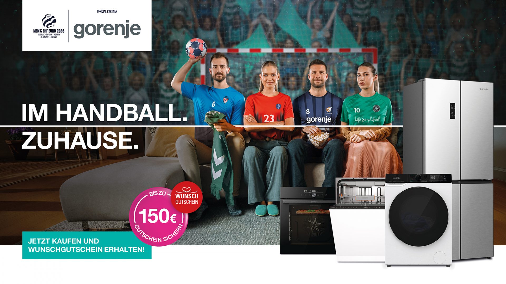 Um dem Handel einen weiteren Abverkaufspush zu geben, startet Gorenje vor und während der Spielphase der Men’s EHF Euro 2026 eine groß angelegte Gutschein-Aktion. Kundinnen und Kunden, die sich zwischen 1.12.2025 und 8.2.2026 eines der Aktionsprodukte kaufen, dürfen sich über einen Wunschgutschein im Wert von bis zu 150 Euro freuen. Die Registrierung erfolgt online über die Landingpage: https://gutschein.gorenje.de/