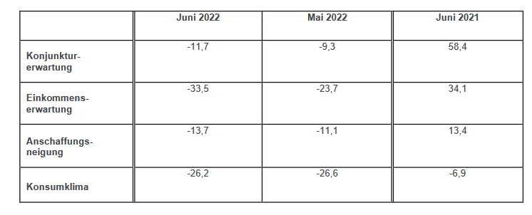 Nach einer kurzen Verschnaufpause im Vormonat setzt die Verbraucherstimmung in Deutschland ihre Talfahrt im Juni fort. Sowohl die Konjunktur- und Einkommenserwartung als auch die Anschaffungsneigung müssen Einbußen hinnehmen. So prognostiziert GfK für das Konsumklima für Juli -27,4 Punkte und damit 1,2 Punkte weniger als im Juni dieses Jahres (revidiert -26,2 Punkte). Dies sind Ergebnisse der GfK- Konsumklimastudie für Juni 2022.