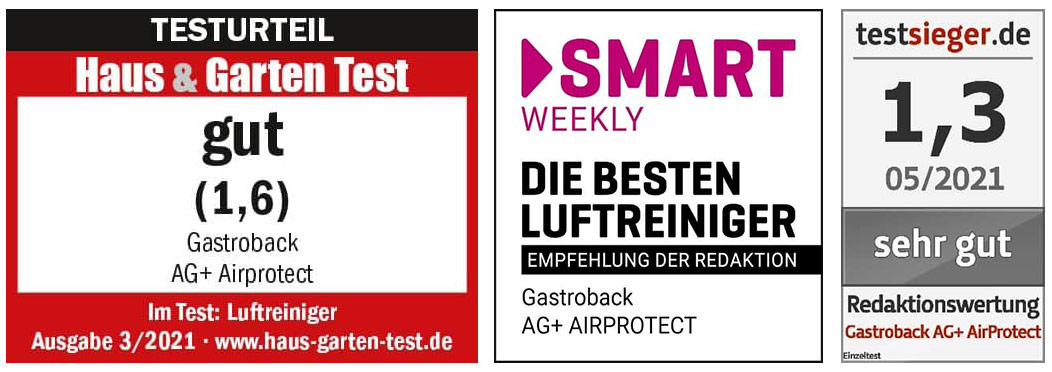 Die Raumluftreiniger AG+ Airprotect und AG+ Airprotect Portable von Gastroback verfügen über eine antivirale Filtertechnologie, welche 99% der luftübertragenden Viren und Aerosole entfernt und COVID-19 Viren inaktiviert. Ideal auch für Allergiker und Asthmatiker, erfassen Vorfilter grobe Partikel wie Blütenpollen, Haare und Hautschuppen. In verschiedenen unabhängigen Produkttests erhielten beide Modellvarianten jeweils hervorragende Empfehlungen.