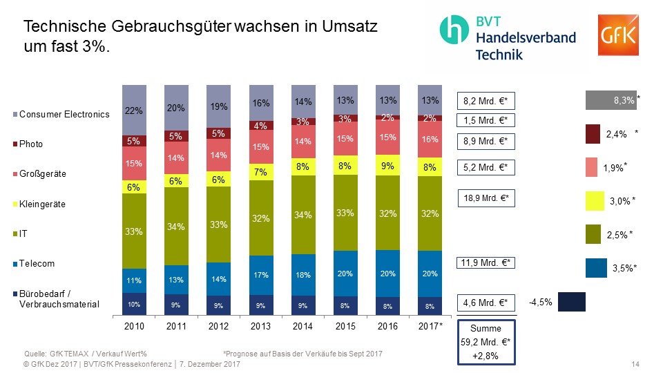 Aufgrund der verkürzten Adventszeit rechnet der BVT mit einem umsatzstarken Jahresendspurt. Geschäftsführer Willy Fischel: „Kommender Samstag, der 23. Dezember, dürfte einer der umsatzstärksten Einkaufstage werden.“ Und: „Die letzte Woche vor Weihnachten entscheidet maßgeblich das Jahresergebnis.“ Gefragt unter dem Weihnachtsbaum sind in diesem Jahr vor allem Saugroboter, Kaffee-Vollautomaten und Smartphones. „Die treiben den Markt“, so Fischel, der ein Trading Up quer durch alle Sortimentsbereiche konstatiert: „Komfortabler, schöner, besser, schneller und schärfer ist gefragter denn je.“